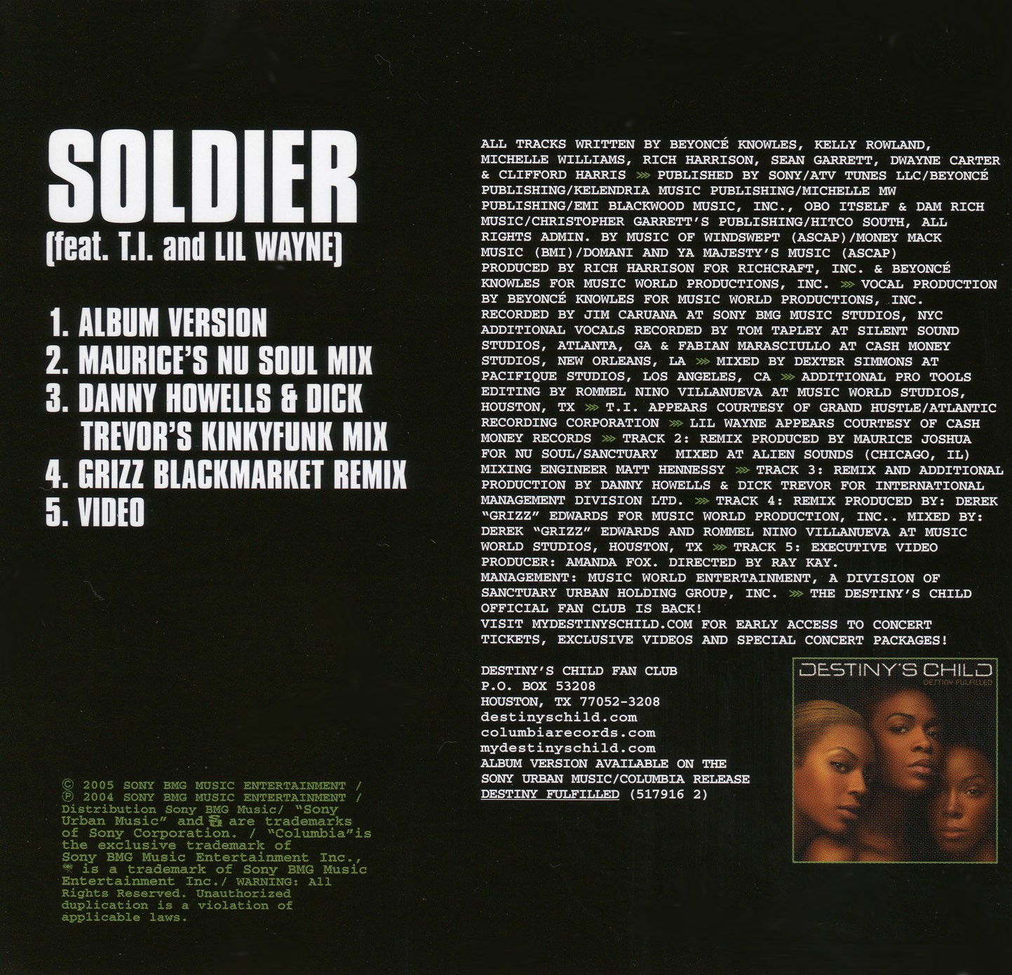 Soldier Destiny's Child a song from destiny's child's album destiny fulfilled, featuring t.i. listen to soldier (feat. & lil' wayne) on spotify. The lyrics describe the type of guy that can make the. destiny's child featuring t.i. watch the soldier (feat. & lil wayne) music video by destiny's child on apple music. Destiny fulfilled(2004), columbia records (sony bmg music.. Soldier Destiny's Child.